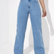 - SUPER STRETCH DENIM - SEAMED FRONT - HIGH RISE- NATURAL FRAYED HEM WITH SLIT DETAIL - MEDIUM STONE WASHFRONT RISE : 11\"INSEAM : 33\"LEG OPENING : 26\"MODEL IS 5' 9\" WEARING SIZE 26Made In: VietnamFabric Contents: 93% COTTON 6%POLYESTER 1%SPANDEX