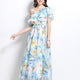 Details include a floral multi print, an off-shoulder neck, fluttering layered ruffles, a sleeveless, elasticized waist, a long maxi dress, and an open side look. inside lined Model 5'7'' Bust 31 Waist 23 Hips 34 wearing a smallS: bust 32 inches, waist 26 inches elasticized, length 53 inchesM: bust 34...